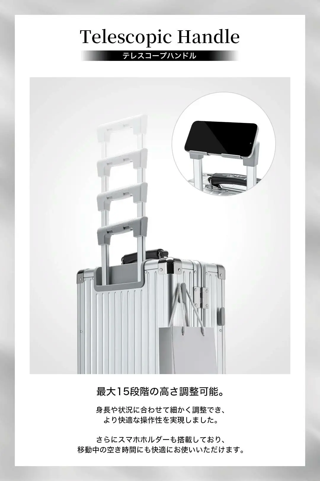 - 15段階高さ調整可能なキャリーバー(振動幅10mm以下)/ご自身に合った高さに調整できるため、性別や身長を問わず快適にお使いいただけます。