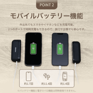・モバイルバッテリー機能付き:スマートフォンやタブレットの充電にも対応。外出時の電源切れも安心。