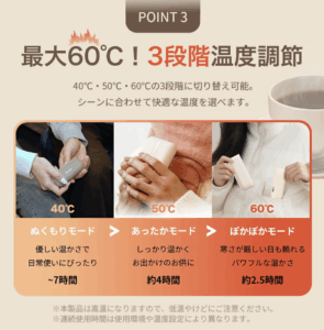 発熱温度(約) 40℃/50℃/60℃の3段階切替可能