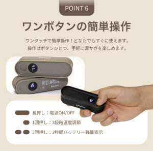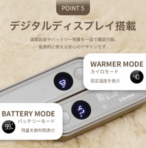 ・デジタル表示搭載:温度とバッテリー残量をひと目で確認できるスマートな操作性。